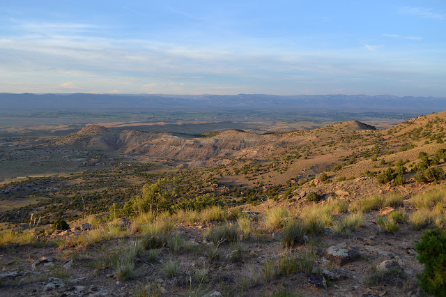 I aimed at starting the Rabbit's Ear Trail in time to finish around sunset, somehow doing the math without quite understanding how late sunset is this time of year. I am trying to get around the other thing that happens this time of year: it is very hot. The car thermometer reads 104°F at 6PM when I get to the trailhead. The trail is a lollipop, traversing a ridge to the north end of the Rabbit's Ear Mesa, then looping around the edge. A sign with a large topographic map claims it is 5.6 miles total while the loop is 4.2 miles and the stick 1.4 miles, a total of 7 miles to finish. At this temperature, that can be over a liter of water difference, so very important to planning what to bring. I have four liters and grab it all and very little else. It seems like too little as I listen to the giggles from the people playing cards in their air conditioned camper next to me.