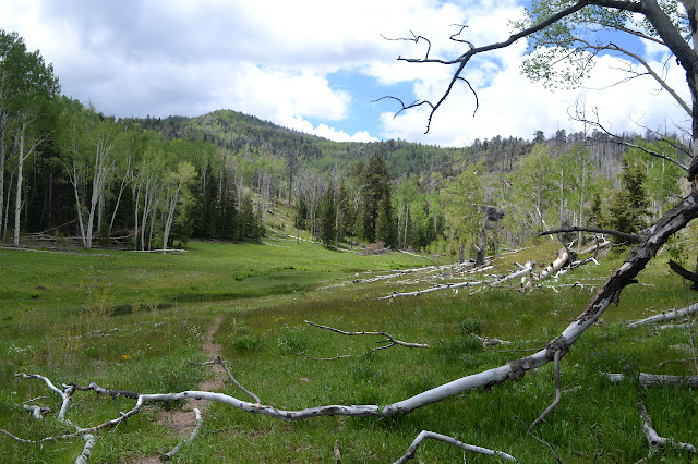 In the burn, standing dead trees are everywhere, only interrupted by those that have already fallen. A small stream flows down the middle of it. It must have been dark and cool under such a thick cluster of trees. The trail is easy to follow, even when the fallen trees require a new route. Large and small cairns are common through here anyway. At the top, I enter into the Pine Valley Mountain Wilderness, which is distinguished by very little, but rolls out in front of me quite impressively.
