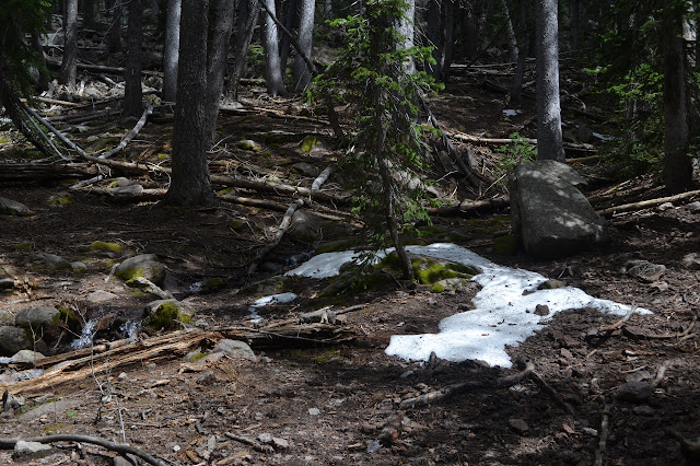 Heading up the trail again, there is a junction to tell me which bit of trail on the map I am on, but there is never a joining of another trail. As it gets into the trees, there is a big campsite. The creek is flowing very well and it is quite nice to hear. As I climb, I am looking for a spot that looks like a good place to head up the Big Point. Snow patches start to appear as I near 10,00 feet.