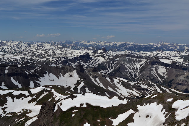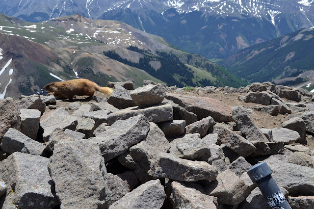 Some take tougher routes, but we can get up the mountain with minimal class 2 scrambling until we hit a wall. Those who are prepared for it take out their climbing helmets. I can see why someone would claim that it is "2+" as claimed in SummitPost, handholds and footholds are numerous and large and solid, but it is continuous use of those holds for a vertical distance of at least 100 feet. I feel like it is an irregular stone ladder as I climb. At the top, there is a short walk along a ledge, a few more feet to climb, and we stand at 14,015 feet on the top of Wetterhorn Peak. This peak is much smaller in area than Uncompahgre Peak was. The marmots are up here, too.
