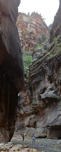 When the canyon gets too narrow even for a walkway, that too ends. A few people are playing in the river here, many turn around, but most seem to continue on. Many people are wearing rented shoes and holding onto rented wood staffs. I pull off my socks, but keep my shoes on. The reviews for neoprene socks seem to be all about how cold someone's feet got while walking the Zion Narrows, but today there is no need. The day is warm and the river feels perfect. Well, maybe a little bit cool, but not uncomfortable.
