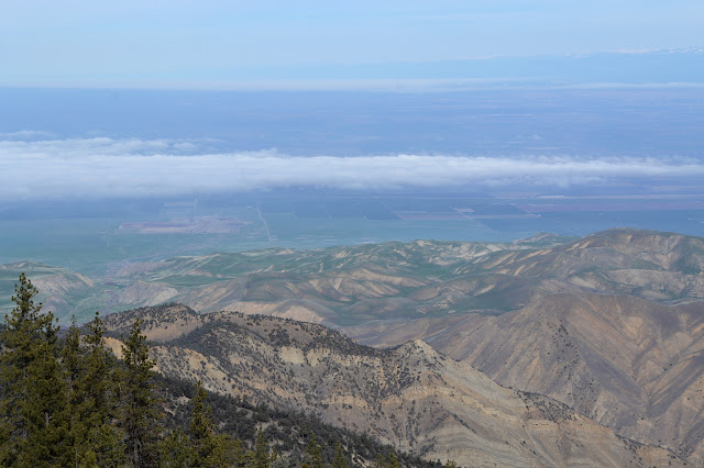 The geocaches I am going after are not actually at the peak, but continue on past it. I figure I will go out to the furthest one and then just wander upward to the peak since I do not know where HPS likes to start. It is soon clear why the geocaches are where they are. The wide road ends in a large parking area with a massive view. It is quite a drop down into the foothills and out to miles and miles of flat. Southern Sierra Nevada peaks look crisp in their white snow coats in the distance out past the squares of farmland.