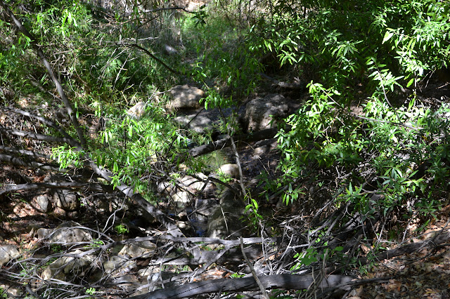 Over a third of the way to the falls, I can finally get on some real trail. It drops down quickly to the creek and crosses over. The creek is just a bit of mud. That is not a good sign for the state of the falls. A couple of those same escaped green parrots are squawking in one of the sycamore trees just a little further up the canyon. There is not so much mud as I was worried that there might be. Although it is a cool day, it is still nice to be under the oaks.