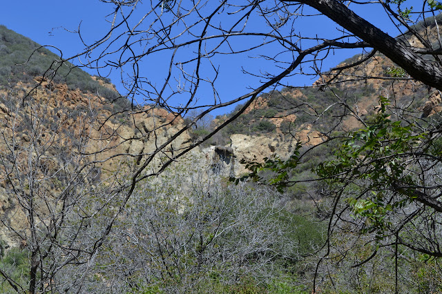 There is a split where most go right, but it does not matter as the trail rejoins soon after. After a third creek crossing of only stiff mud, it breaks out of the trees into chaparral and the heat. There is a little of it today. The first glimpse of the very top of the upper falls looks nearly dry, but then there is the sound of running water with an accompaniment of frogs. There is still some hope of a waterfall.