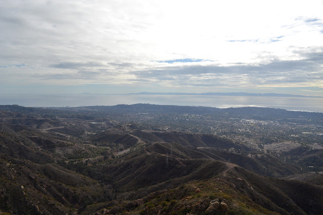 The rain did not start at midnight and it is still somewhat warm and sunny and I could jaunt at least a little way up the hill before the green shadow passing Lompoc on the weather map gets to here. I almost take the turn for Gibraltar Road before remembering where I am headed up by the water filtration plant. So off I go, on the still quite dry trail. The poison oak is almost entirely dormant making the picnic table in the middle of it look much more inviting. The junction to start up Arroyo Burro instead of Jesusita is still marked. There is plenty of dirt beside the steep paved road to walk on and it remains well marked, too. With the utility road section, it all seems steeper and harder than I remember. Maybe that easy slope yesterday spoiled me for this. Whatever, it does give ample opportunity to just turn around and try to take in what may be the most expansive views of the city that the trails have to offer.